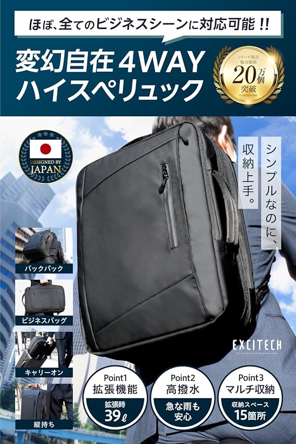【細部へのこだわり】39リットルの大容量/4箇所の防犯機能/2WAY/撥水加工/止水ファスナー/使用/17インチPC対応/拡張機能/多収納/出張時にスーツケース不要/背面セキュリティーポケット付き/Suicaなどの出し入れ楽々ポケット/等の多機能ビジネスリュック。