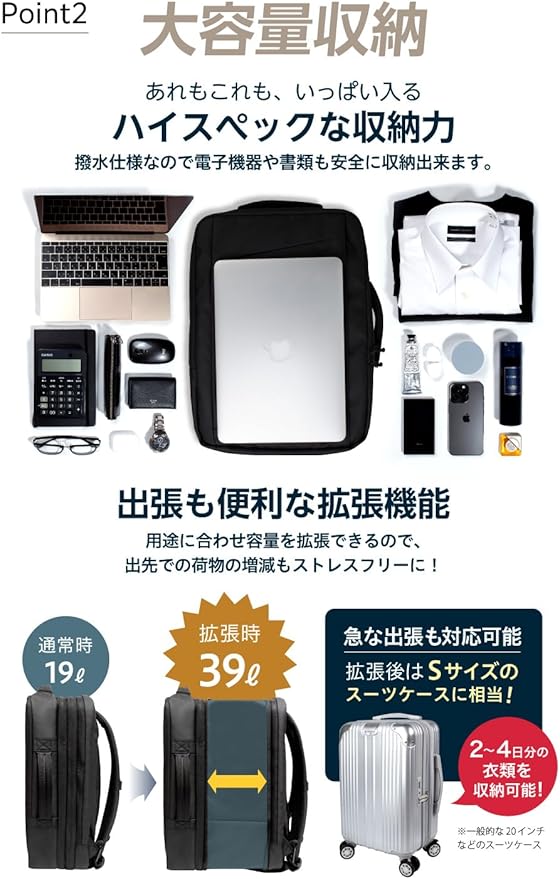 【大容量 拡張機能】約42cm 約30cm 奥行き 約15cm(拡張前:約19L)(拡張後:約39L)17.3インチノートパソコン、A4サイズの書類やファイル、2~4日分の衣類等もたくさん入るので、出張や旅行に便利なビジネスリュック。キャリーケースに固定出来るので移動時も楽です。