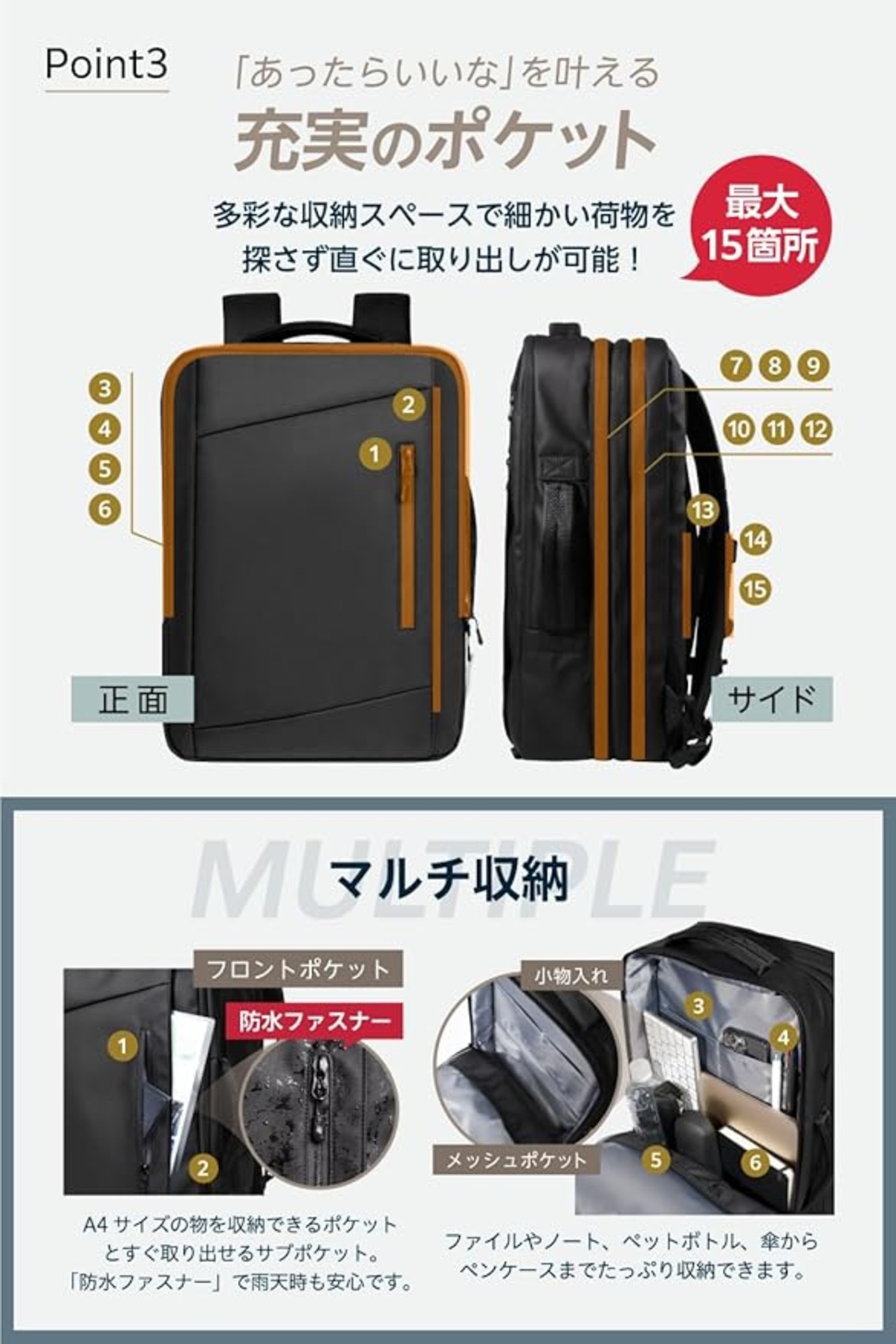 【マルチ収納】使用頻度が高いものを入れるスペース。A4サイズのファイルなどたっぷり収納できます。 【トランク収納】乾湿分類ポケット付きで、2〜4日分の衣類と、濡れたものを分けて収納できるので出張や旅行に重宝できます。 【デバイス収納】パソコンや書類入れるのに最適なスペース。17インチのPCも楽々収納でき、縦横どちらからも取り出しやすい仕様です。 【盗難防止ポケット】背面には、デイリーに使う携帯やお財布等の貴重品が出し入れしやすいポケット付きです。