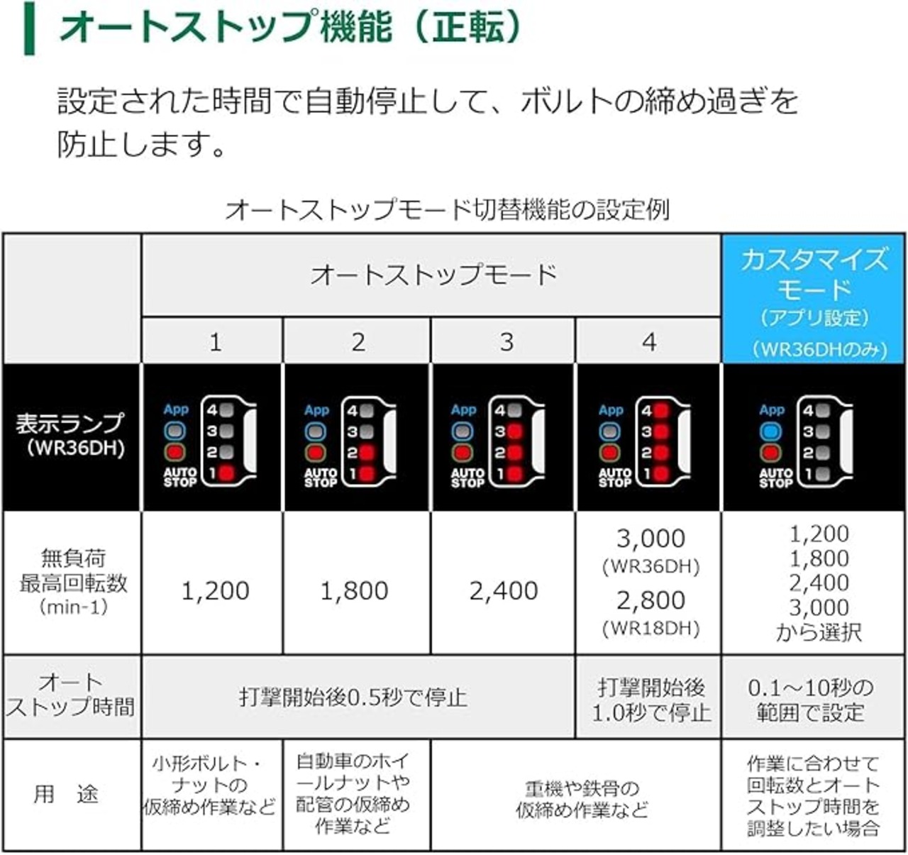 あらかじめ設定された時間・回転速度に自動で停止・変速し、ナットの脱落や締めすぎ防止に役立つオートストップ・オートスロー機能搭載。