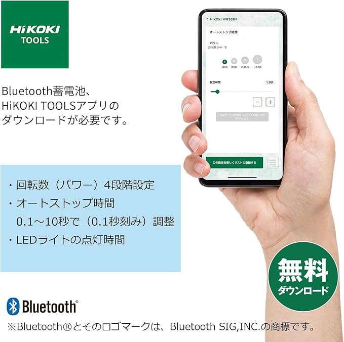 Bluetooh蓄電池使用時、HiKOKI TOOLSアプリとの連動で回転数、オートストップ時間、LEDライトの点灯時間が設定可能。