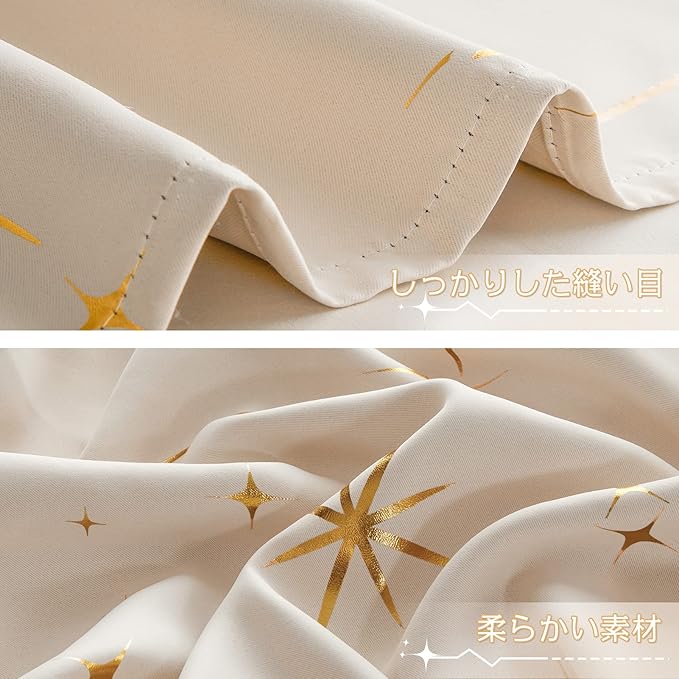 【生地】:箔プリントで星柄が綺麗なカーテン。光の当たり具合により箔プリントがキラキラ光って見えます。滑らかな100%ポリエステルの生地で、一年中にも使えます。