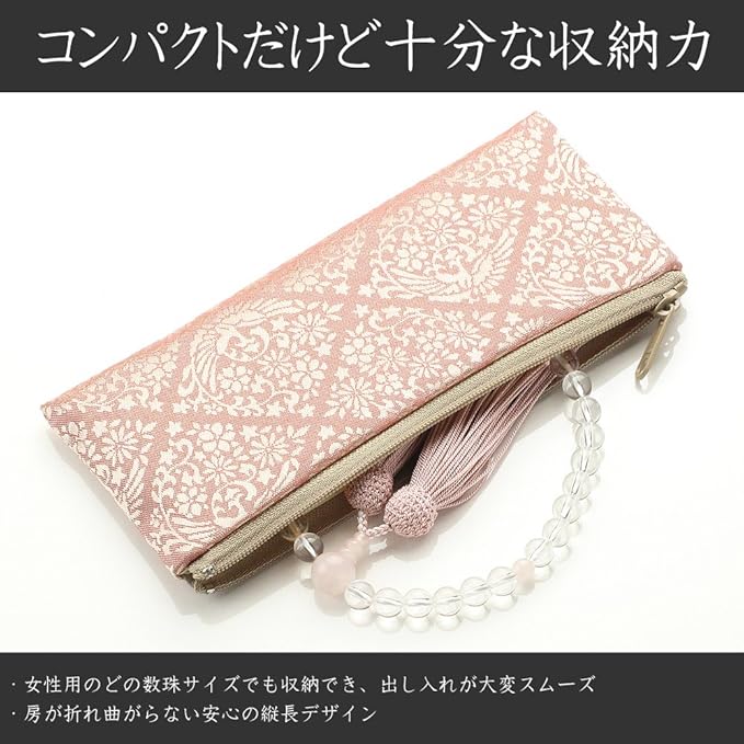 細長タイプで収納が便利な高級ファスナー式数珠袋をお付けさせていただきます。
