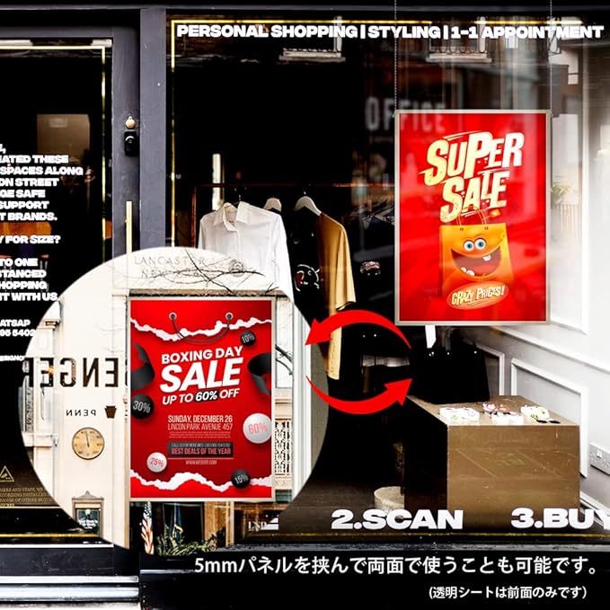 ポスター・写真・POPなど、幅広く利用でき、軽くて丈夫なアルミパネルです。フレームの左右のネジ(2個)を取り外せば作品の出し入れが簡単にできます。前面はフラットで、背面はストライプのデザイン。フレームの表裏を変え、両面額装も可能なので利用範囲が広がります。(透明シートは前面のみです)タテ・ヨコどちらでも使用できます。吊り下げ用のヒモは付属していませんのでご注意ください。