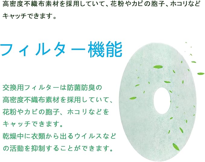 【機能】交換用フィルターは防菌防臭の高密度不織布素材を採用していて、花粉やカビの胞子、ホコリなどをキャッチできます。乾燥中に衣類から出るウイルスなどの活動を抑制することができます。