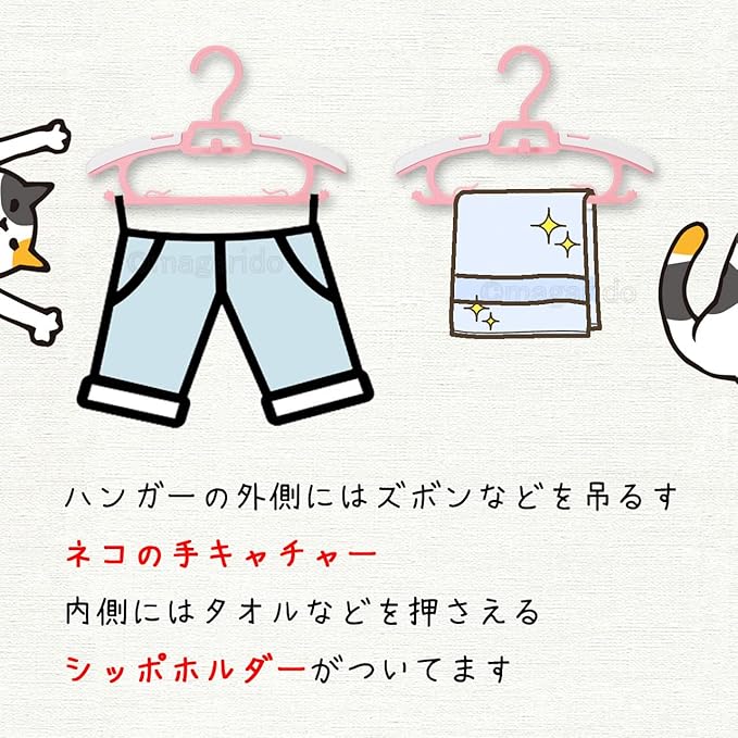 【かわいい】◇ズホン掛けが猫の手に、タオル掛けがネコのシッポになっています ◇可愛いハンガーですのでお子さまの洗濯物干しのお手伝いデビューにもおすすめです ◇かわいいデザインなので、出産祝い、プレゼント、お祝いにおすすめです