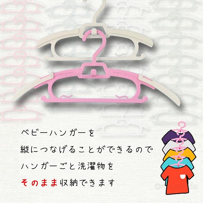 【多機能】◇ハンガーのショルダー部はスライドしサイズ調整ができるため、赤ちゃんが大きくなってもハンガーを伸縮させることで長く使えます ◇ショルダー部には滑り止め加工がされているので滑りにくくなっています ◇下着などを掛けるフックが2箇所に付いています。