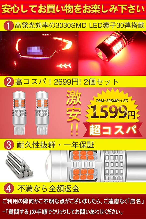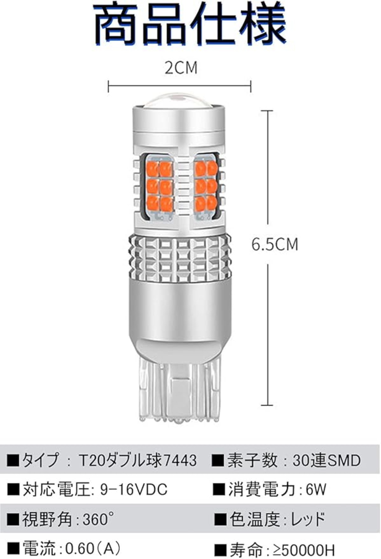 T20 ダブル球 レッド 7443 LED ブレーキ テール ウインカー ストップ ランプ バックランプ 汎用 30連 3030 LEDバルブ 12V 無極性 t20 led ダブル プロジェクターレンズ付き 高輝度 ダブル t20 LED 7443 W21/5W バックライトLEDバルブ 50000時間以上寿命 取付簡単 赤 2個入り (T20ダブル球7443, レッド) | etshop
