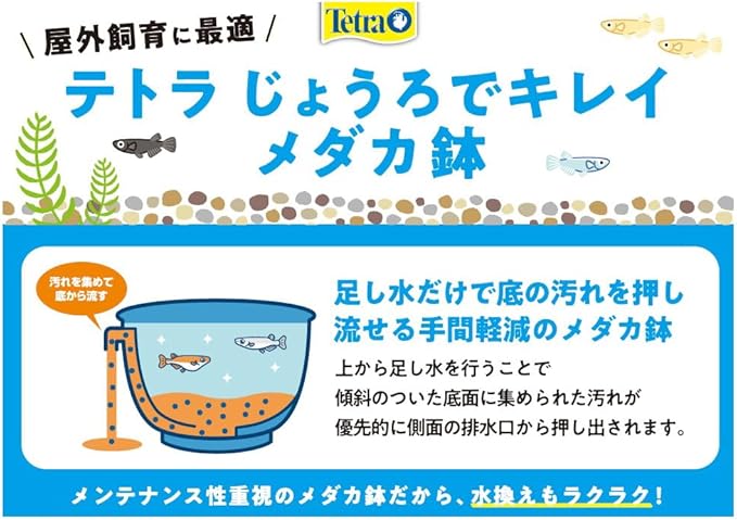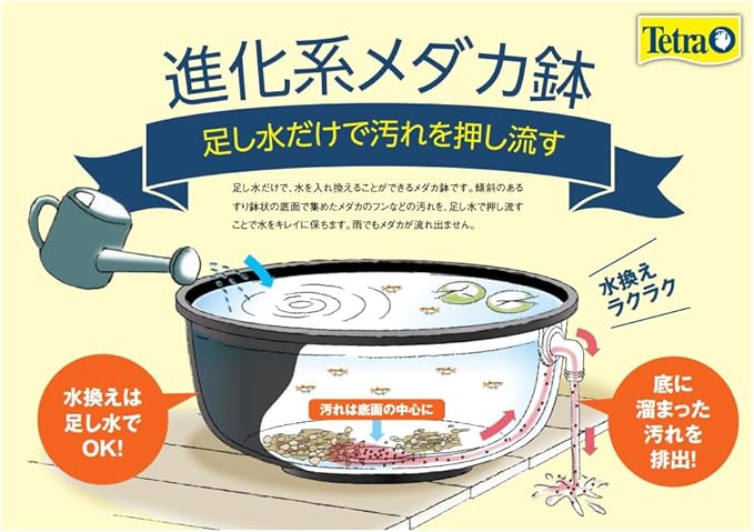 ●足し水だけで、水を入れ替えることができるメダカ鉢です。●すり鉢状の底面で集めたメダカのフンなどの汚れを、足し水で押し流すことで水をキレイに保ちます。●雨でもメダカがあふれません。●丈夫なポリプロピレン製。●MADE IN JAPAN