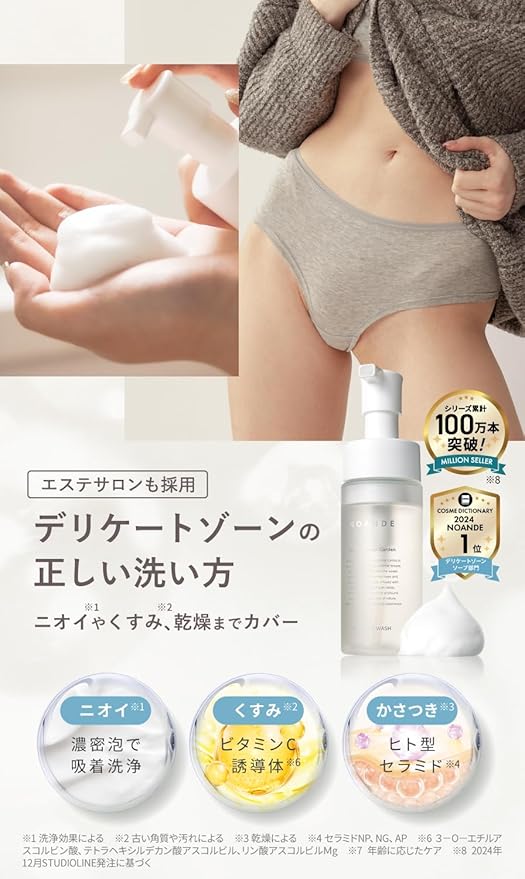 ✅特徴:デリケートゾーンソープのきめ細やかでもっちりなマシュマロ泡が摩擦から守りながら、ニオイ※1の元をしっかりオフ。さらに同時にパックをすることで、気になる乾燥やくすみ※2にもアプローチ。