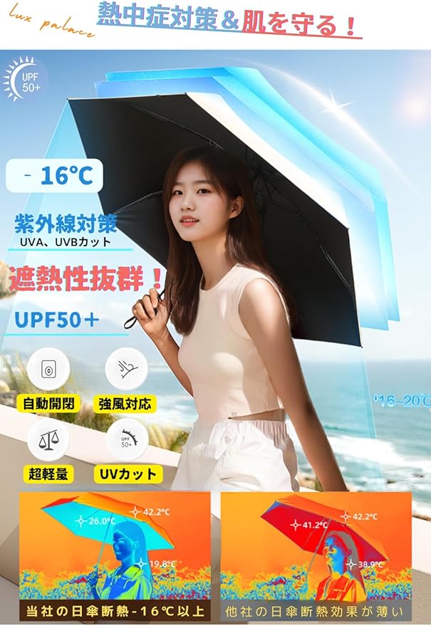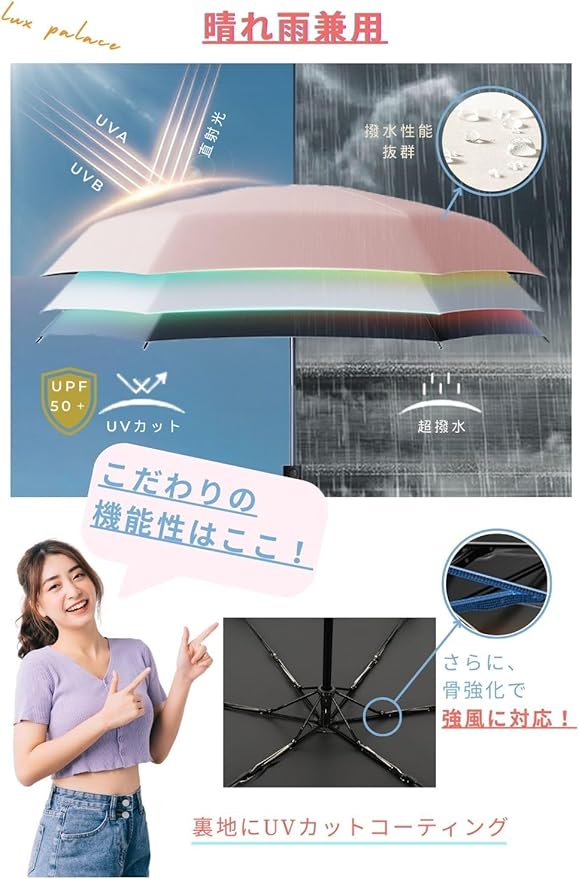 ☂【UVカット*完全遮光】高密度の傘布、多重層設計、優れた品質と断熱性、紫外線防止、UPF50+ 、真夏の強い日差しを遮り、大切なお肌を太陽光線、紫外線からガードでき、日焼け対策アイテムとして猛暑を乗り切れます。UVカット率は99.9%以上です。 ☂【超軽量*携帯便利】 折りたたみ日傘は特別なデザインで、バッグに簡単に入れることができます。折りたたんだ長さは23cm、重さは約220gです。超コンパクトボディで使用にも持ち運びにも最適!!全ての天候に対応し、雨の日も、雪の日も、晴れの日も使用できます。通学、通勤、遠足、旅行、出張などの場合にご利用ください。 ☂【自動開閉折りたたみ傘】 ワンタッチで自動開閉ができる日傘は、片手でも使え、とっさに傘を出して開く際にはストレスがありません。(※勢いよく開くので注意してください。)車の乗り降りの際や、片手しか空いて無い時には大変便利です。普段使いに通勤用カバンや車に常備しておけば、急な天候の変化にも対応できます。 ☂【晴雨兼用*耐風撥水】310T高密度の撥水加工素材で作られ、一般的な傘より撥水性に優れ、軽く振るだけで雨水を振り払え、汚れにくい生地を使用しております。中棒はアルミ合金製造、6本の傘骨にカーボンファイバーとアルミ合金を使用し、耐久性にも優れており、強風にも対応できます。台風や強風時にでも壊れにくい逆さ折れ設計となっているので安心して長くご愛好頂けます。