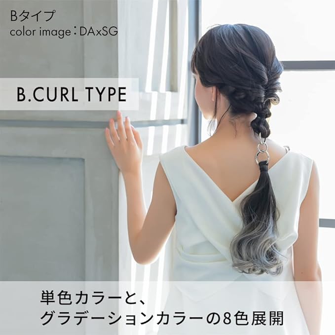 「A.ストレート」「B.カール」の2タイプから選べるお団子にリングを引っ掛けるタイプのポニーテールリングウィッグです。髪が短い方でもポニーテールを可愛く見せられる、新感覚のヘアスタイルです。全20色とカラーバリエーションも豊富なので、可愛く変身できること間違いなし!