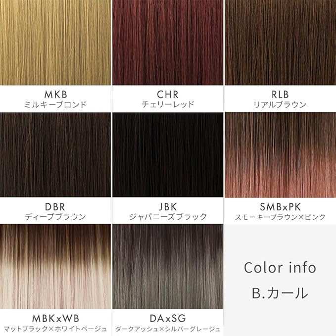 【全18カラー】MKB.ミルキーブロンド CHR.チェリーレッド RLB.リアルブラウン DBR.ディープブラウン JBK.ジャパニーズブラック UNC.ユニコーン PPm.ピーチピンク APm.アップル ACm.アプリコット YEm.イエロー MGm.ミントグリーン BLm.ブルー HBm.ヘイズブルー RPm.ローズパープル GPm.グレープ SMBxPK.スモーキーブラウン ピンク MBKxWB.マットブラック ホワイトベージュ DAxSG.ダークアッシュ シルバーグレージュ