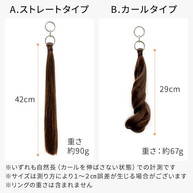 寸法:A.ストレートタイプ:約42cm / B.カールタイプ:約29cm / 【シルバーリング大】外径:約4.0cm 内径:約3.3cm 幅:約0.4cm 開閉幅:約2.0cm / 【シルバーリング小】外径:約2.7cm 内径:約2.1cm 幅:約0.3cm / 【透明リング小】外径:約2.2cm 内径:約1.7cm 幅:約0.2cm ※サイズは測り方により若干の誤差が生じる場合がございます。