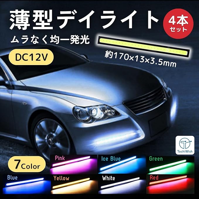 【仕様】サイズ : 約W17cm H1.3cm D0.35cm / 配線長 約18cm / 色温度 : 6000k-6500k / 動作電圧:DC12V / カラー : ブルー(青)、イエロー(黄色)、レッド(赤)、ピンク、グリーン(緑)、ホワイト(白)、アイスブルー