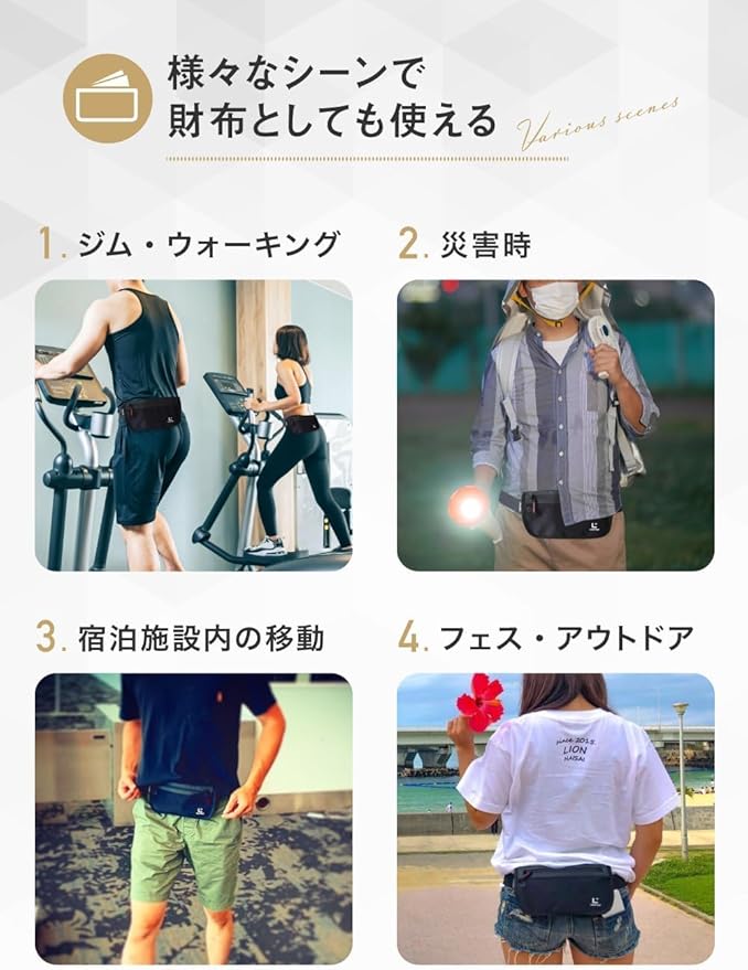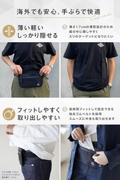 【薄くて軽くてしっかり隠せる】:1.3cmの薄型設計のため服の中にも隠しやすく、外からも着用が分からない防犯スマートデザイン。 【貴重品を守るための設計】:(1)スキミング防止機能(※フロントとメインポケットが対象、背面メッシュポケットは対象外)(2)撥水性の高い高級ライクラ素材(3)高品質YKKジッパー を採用し、使うたびにその安全で快適な機能性を実感できるスペックに。