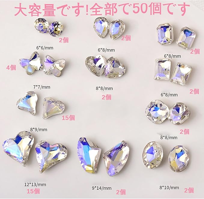 【50個セット】セット内容:ネイルパーツハート8mm 9mmの15個、11mm 12.3mmの15個、楕円形、三角形など20個(上の写真参照)。合計50個入。独立したボックスに入っているため、収納が簡単で便利です。