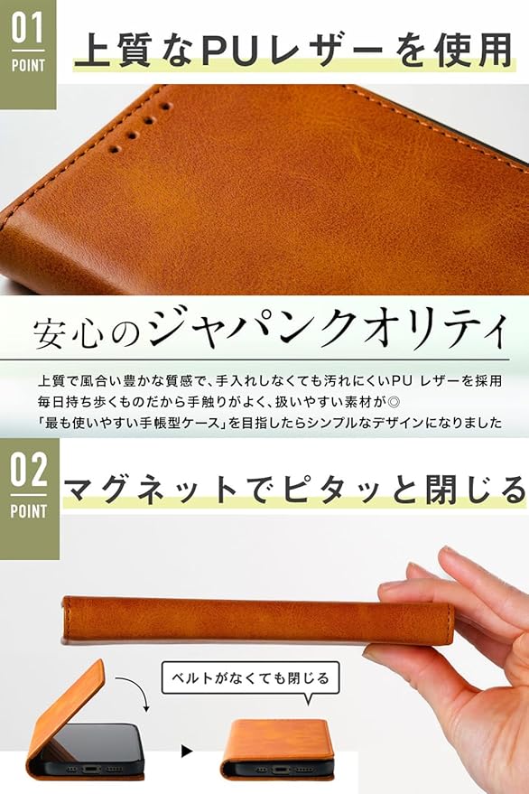 【高級感のある質感と豊富なカラーバリエーション】上質なPUレザーを素材に採用。手触りが良いため使うほど手になじむ質感を体験いただけます。また、お客様のご要望を反映して、11色のスマホケースを準備。あなた好みのカラーをお選びいただけます。