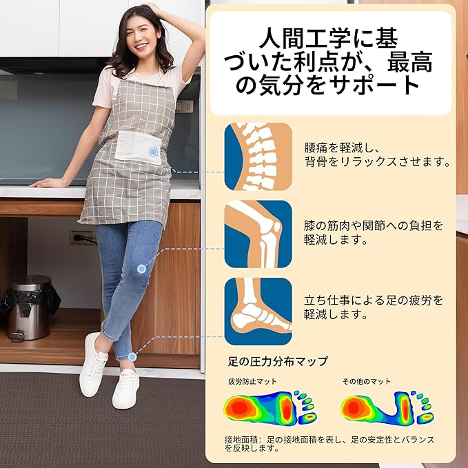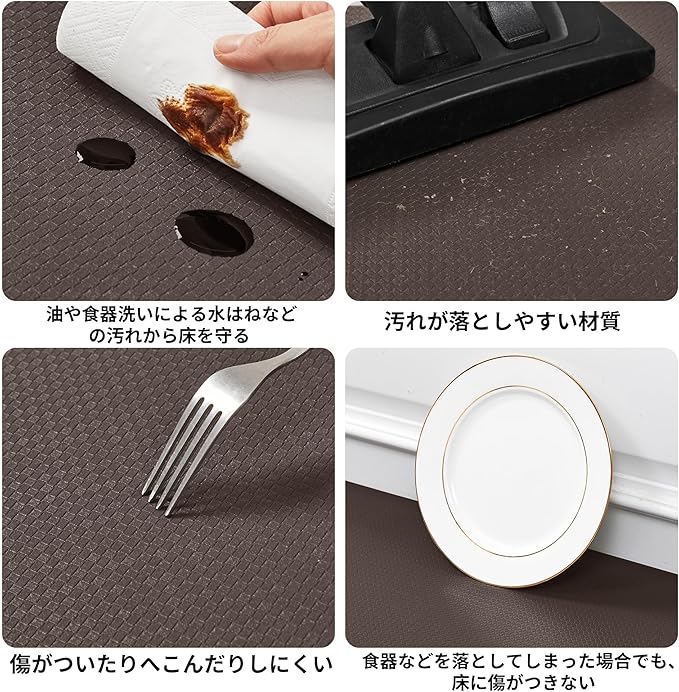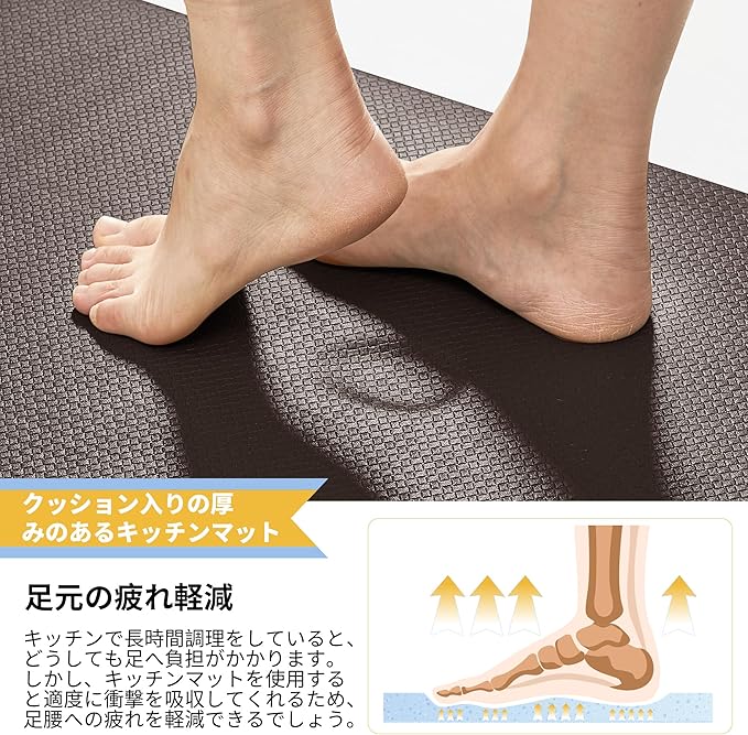 【衝撃吸収力強い】足元の疲れ軽減:キッチンで長時間調理をしていると、どうしても足へ負担がかかります。キッチンマットを使用すると適度に衝撃を吸収してくれるため、足腰への疲れを軽減できます。足元の冷え防止:冬場は室内が暖かくても、暖かい空気は上に昇る性質があることから、床や足元は冷えやすくなります。キッチンマットを敷けば、床の冷たさが足に伝わりづらくなるため、足元の冷え防止としても有効です。衝撃吸収力のあるキッチンマットを使うと、ものを落としたときのダメージを抑えられます。傷がついたりへこんだりしにくいです。食器などを落としてしまった場合でも、床に傷がつきません。