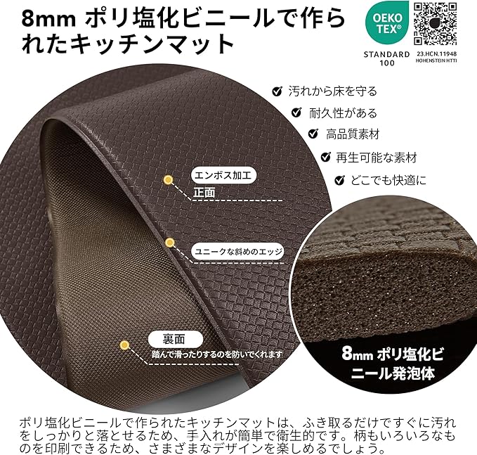 【両面滑り止め加工】正面はエンボス加工、裏面は踏んで滑ったりするのを防いでくれるシリコン滑り止め加工です。いい滑り止め付き、キッチンマットがずれにくく利便性が向上します。ただし、滑り止めがついている分マットの厚みが増すため(約8mm)、収納場所の確保や引き戸の開け締めがスムーズにできるかどうかも考慮しておきます。