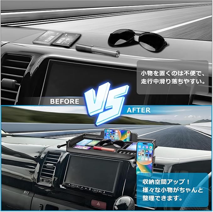 2.【素材】:本体:高品質ABS樹脂製 (耐高温) ラバーマット:環境にやさしいゴム(滑り止め加工済み)。【商品内容】:ダッシュボードトレイ本体*1、スマホホルダー*1、ボールジョイント*2、黒ラインゴムマット*1。