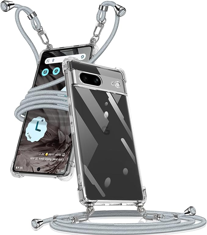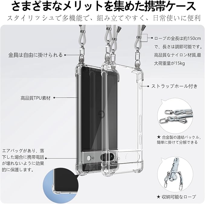 Google Pixel 7 ケース クリア ショルダー Google Pixel 7 スマホケース ピクセル7 カバー 肩掛け 斜めかけ 縄掛けケース 透明 薄型 軽量 TPU 携帯ケース 紐付き 斜めがけ 織りストラップ付き 長さ調整可能 取り外し可能 落下防止 紛失防止(シルバー) | etshop