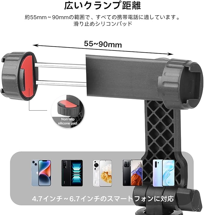 【幅広い交換性】スマホ三脚マウントはケースの有無にかかわらず・長さ55mm-90mm・厚さは12mm以下のサイズのスマートフォンをしっかりとサポートできます・二ヶ所の滑り止めがあり。
