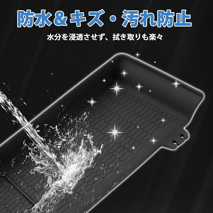 3.【防水性、利便性】トレイの表面には3Dグルーヴがあり、液体、埃などの汚れから車内の清潔を保ちます。更にシリコン製の素材は水洗いが可能で、トレイをいつでも清潔に保てます。