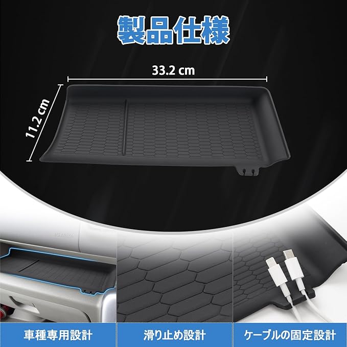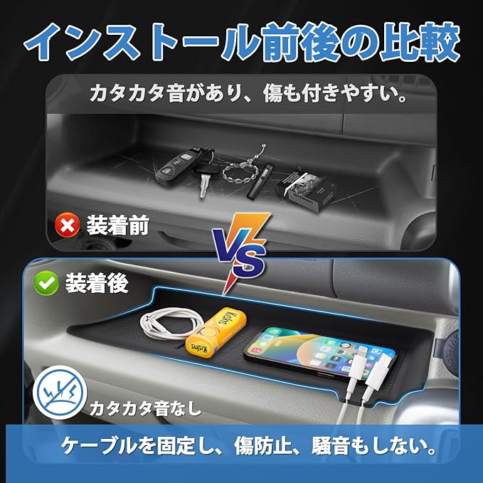 2.【素材&騒音防止】:耐熱性、耐衝撃性、耐磨耗性に優れたシリコンゴムを採用し、車の振動を吸収し、運転中で助手席トレイの小物の滑りによる騒音を減らす。