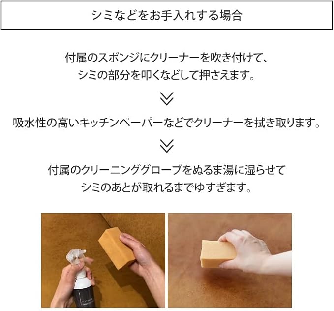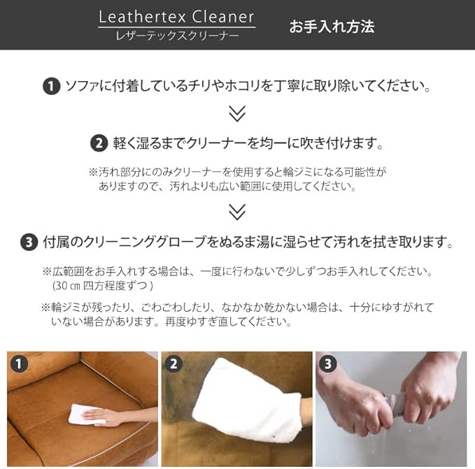 【クリーナー】汚れがついてしまっても簡単にクリーニングできます。【プロテクター】クリーナーでのクリーニング後に撥水加工が出来ます。乾燥後(約1時間後)には製品をすぐにお使い頂けます。プロテクターの撥水効果はお使いのソファの使用方法にもよって異なりますが。7か月~1年を目安として、水滴実験などをしてご確認下さい。【セット内容】レザーテックスクリーナー(125ml) 1、レザーテックスプロテクター(125ml) 1