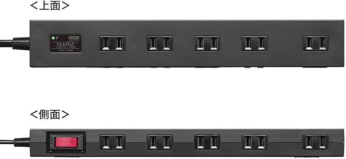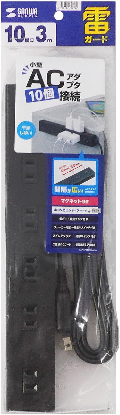 サンワサプライ(Sanwa Supply) 電源タップ 10個口・2P (3m) たくさん挿せるレイアウト 雷ガード マグネット ほこりシャッター 一括集中スイッチ スイングプラグ ブラック TAP-SP2110N-3BK | etshop