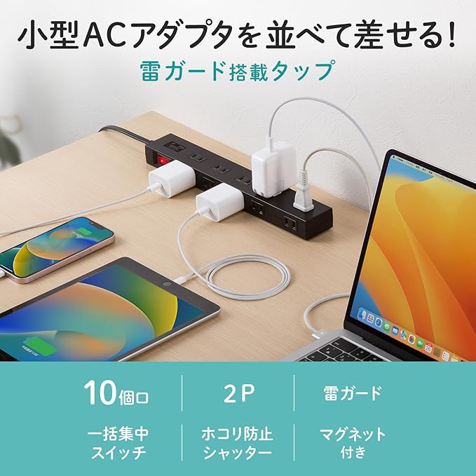 小型ACアダプタが差し込める(差込口ピッチ45mm)10個口電源タップ。iPadなどのタブレットの充電器接続に便利です。