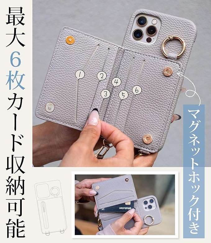 【商品特徴】■ショルダーストラップ付き ■マグネットホック ■カード収納6箇所があり ■スピーカー/充電ホール付き ■スタンド機能付き ■リング付き