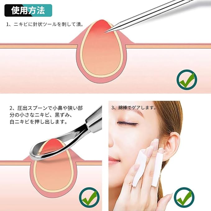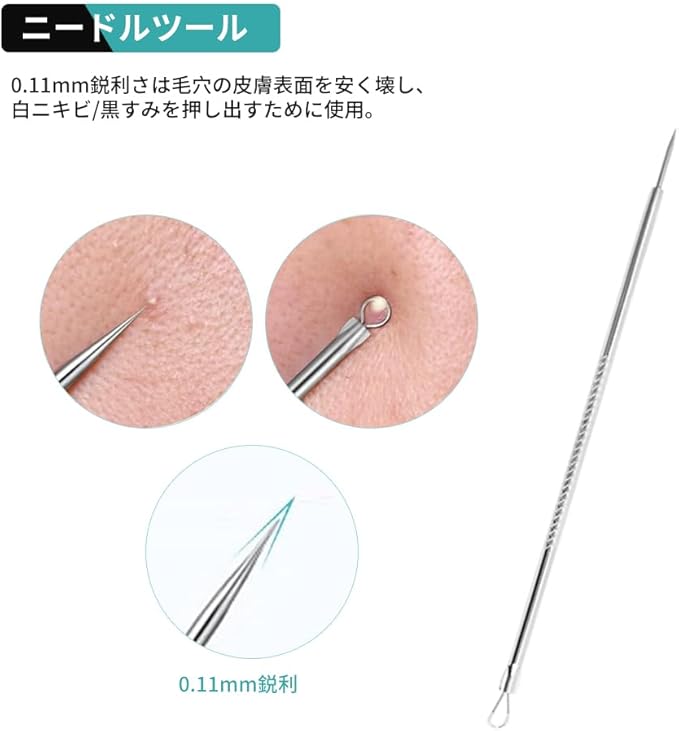 【7本セット】ニキビ取りツールは色々な用途に適しています。顔、鼻周りなどの角栓、黒ニキビ、白ニキビの除去に使用する専用スティックセットです。ニキビや黒ずみだけでなく、毛抜きとしても使用できます。