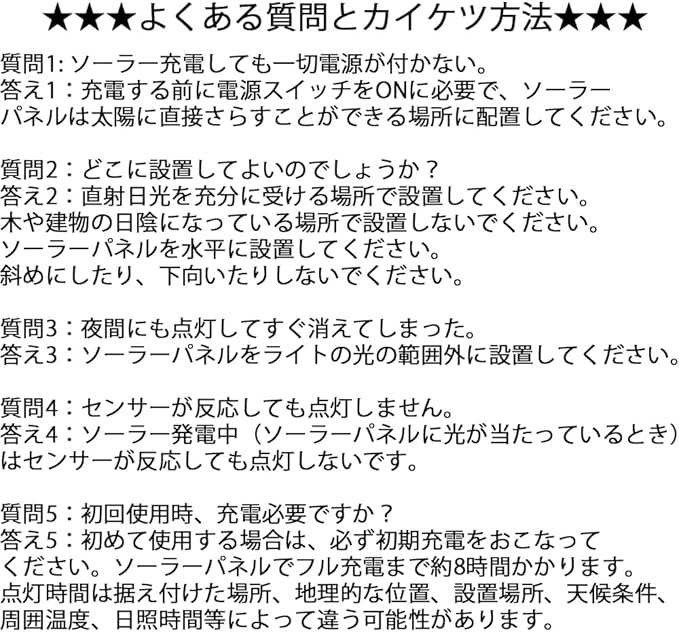安全&省エネ:ソーラーパネル付き、太陽エネルギーを電気に変換することによって、エコな照明です。電気代と設置場所に困らなず、省エネの上に環境に優しい!LEDなので熱を持たないため熱くなりません。