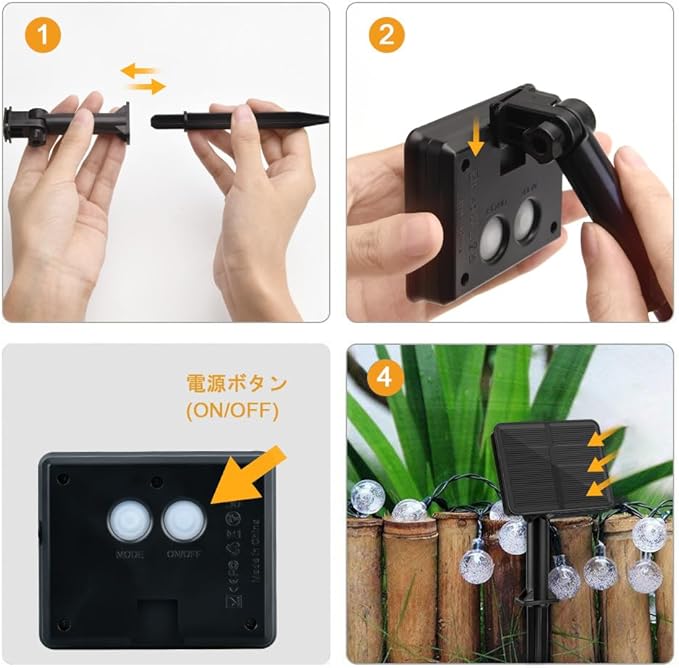 ソーラーライトの原理はパネル裏面にあるスイッチをオンして、直射日光の下に置き、太陽光からソーラーパネルで自動充電します。夜間は辺りが暗くなると、ライトが自動に点灯します。毎晩ライトのスイッチを付けたり・消したりという手間が省け、つい消し忘れてしまった!ということを防げます。周りが明るいと点灯しません。ご注意:ライトの点灯テスト時はソーラーパネルを暗い環境に置くか、手または毛布でソーラーパネルを覆い、点灯を確認して下さい。