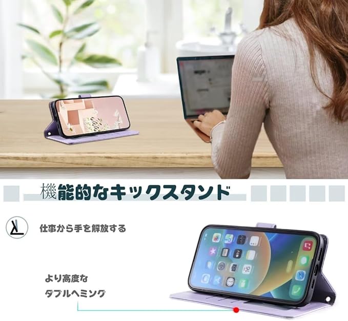 【高品質素材及び設計】大切なスマホを守る安心の手帳型。内部は衝撃吸収性に優れたTPU素材を採用して、落下時の衝撃を効率よく吸収するようにケースの各コーナー内側が設計されています。手触りが良く、キルティングの設計は控えめでエレガントです。