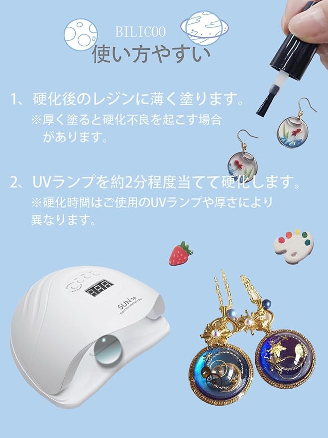 【硬化が速い⬆️】UVランプに約2分間照射すると硬化します。硬化時間はご使用のUVランプや厚さにより異なります。✨uvライトに照射後、かなり熱がこもります。✅必ず冷えてからモールドからお取り出し下さい。
