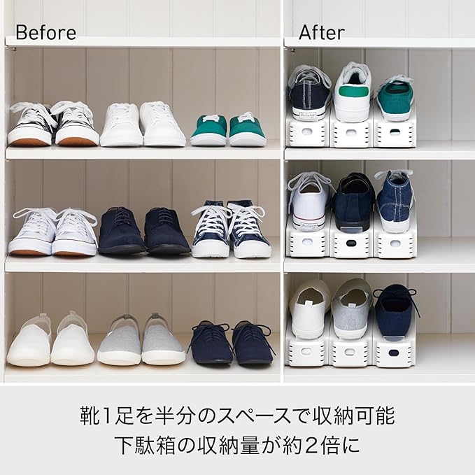1足分のスペースに2足収納でき、収納量が約2倍にアップ。