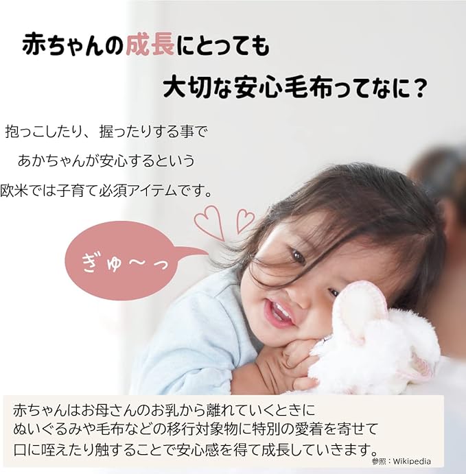 【安心毛布】赤ちゃんはお母さんの乳から離れていく時にぬいぐるみや毛布などに特別な愛着を寄せます口に咥えたり触ったりすることで安心感を得ます。その対象物として作られたのが安心毛布です。