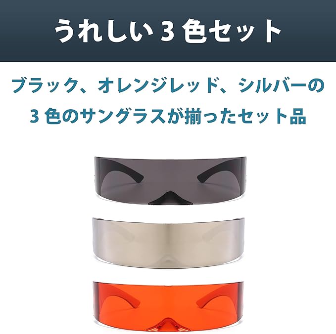 近未来テイストのサングラス:近未来を感じさせるテイストが魅力のサングラスセットです。人と被りにくい個性的なサングラスをお探しの方におすすめの商品です。