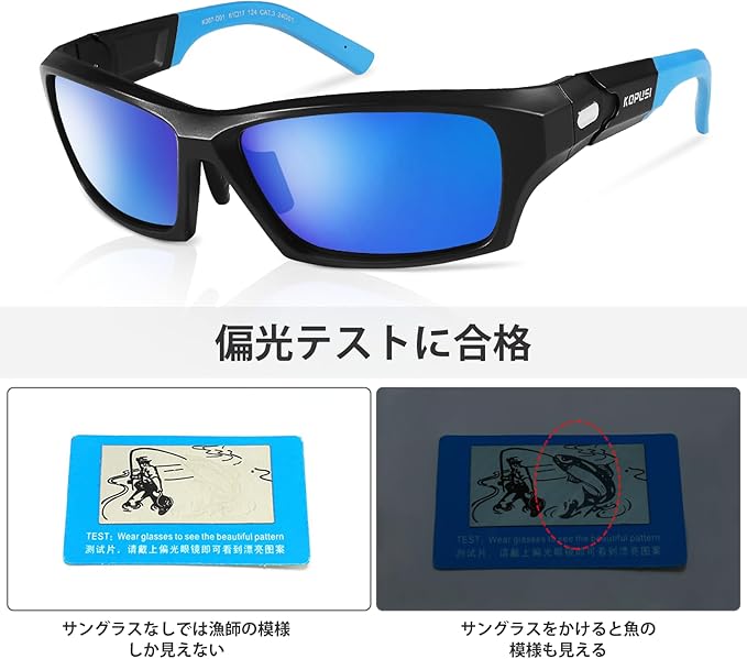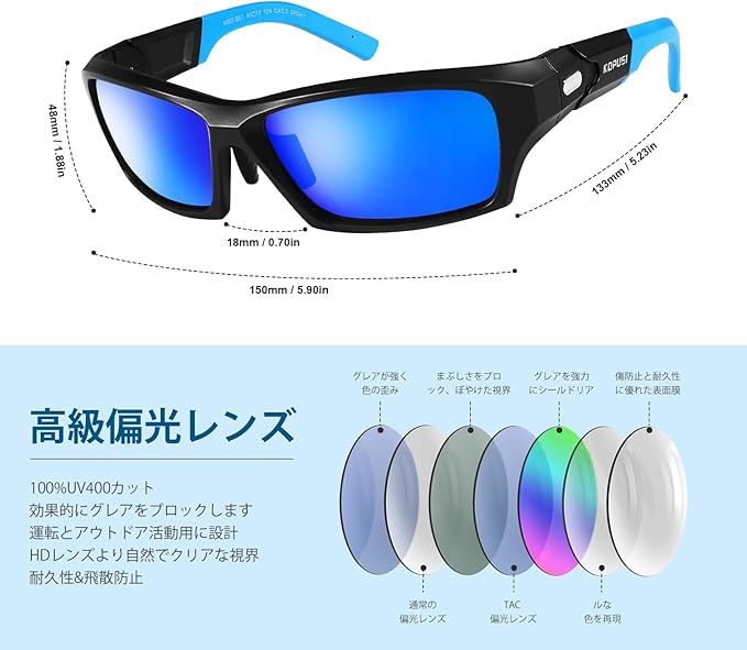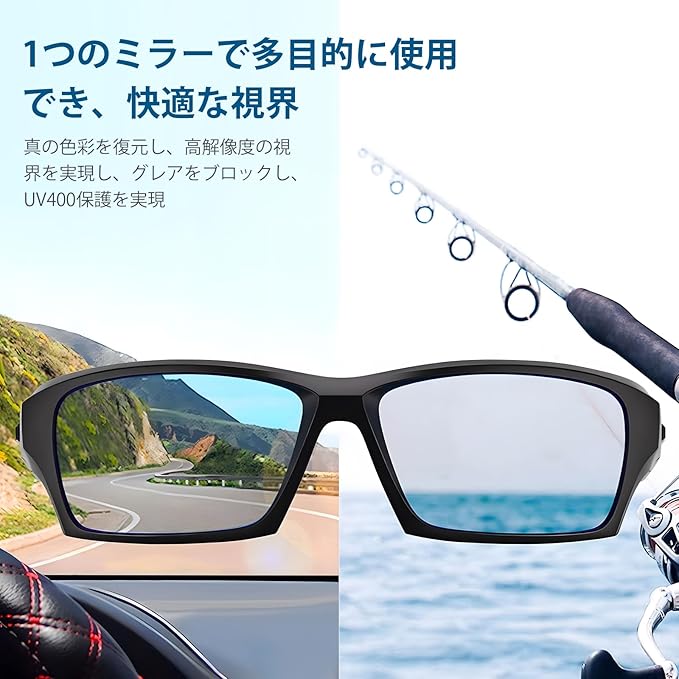 【 高品質な偏光レンズ 】本製品は高品質な TAC 材料の偏光レンズを採用し、UV400 レンズ保護コーティングを施して、有害な UVA と UVB を 100% ブロックします。これにより、本物の色を復元し、視覚の透明度とコントラストを効果的に改善し、反射や散乱光を排除します。風景がよりクリアで柔らかく見え、目の負担を減らし、目を完全に保護します。