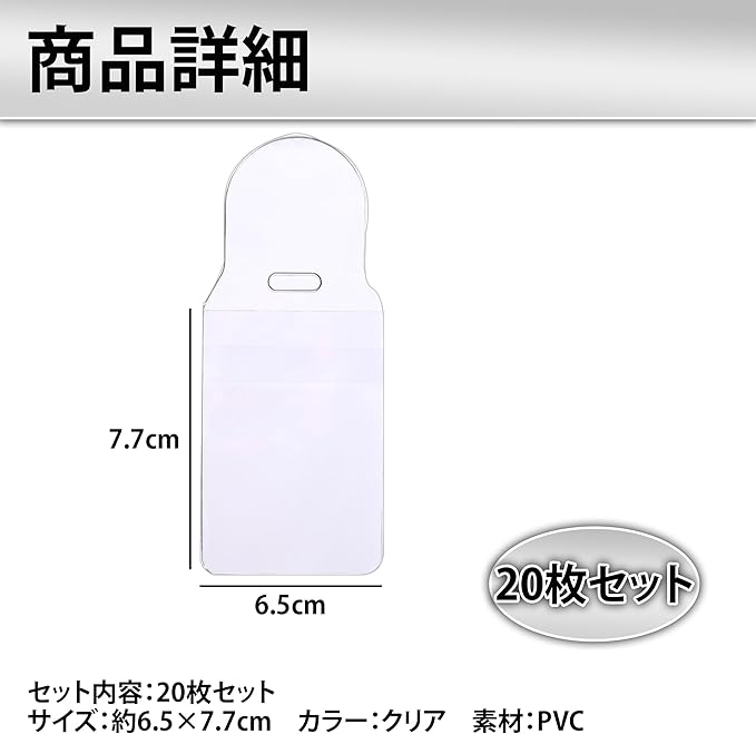 セット内容:20枚セット サイズ:約6.5 7.7cm カラー:クリア 素材:PVC ※モニターの環境等により、色の見え方に若干差が生じる場合がございます。