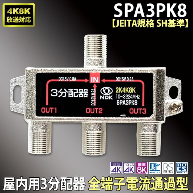 【高い電気的特性】4K8K放送における高い周波数帯域でも高い電気的特性を有しております。高性能部品で設計された当製品は、高周波帯域でも低損失で信号を分配します。