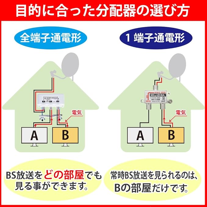 【全端子通電型】IN-OUT間の全端子が通電型の為、TVから衛星アンテナへの電源重畳が可能です。