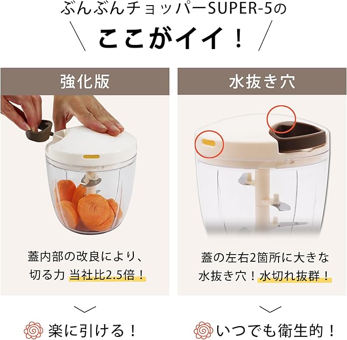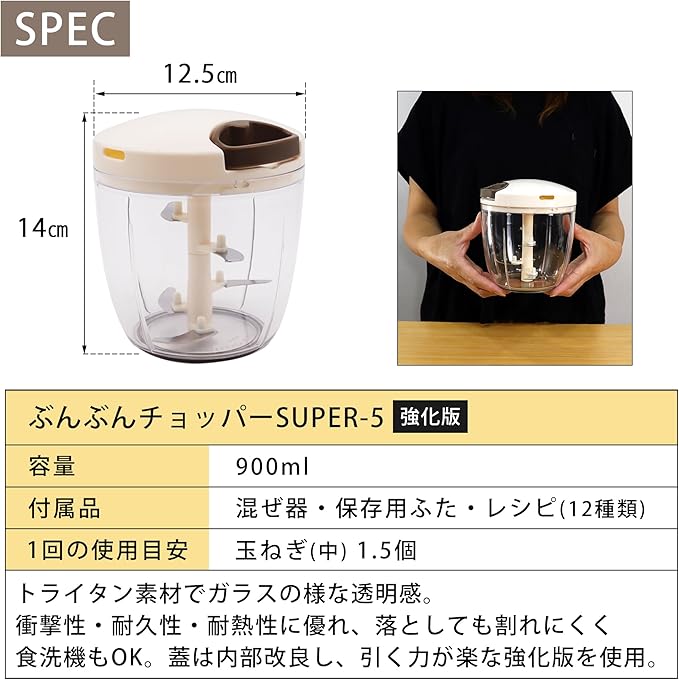素材:[本体]トライタン(飽和ポリエステル樹脂)(耐熱温度120度) [ふた]ポリプロピレン(耐熱温度100度) [取っ手]ABS樹脂(耐熱温度100度) [刃]ステンレス刃物鋼