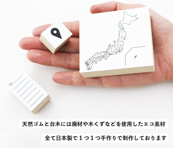 旅行記録や勉強などいろいろ使える地図のスタンプ3個セット。 行ったところに印をつけて思い出をメモしたり 勉強や記録につかったり、いろいろな使い方ができます。おしゃれなデザインと手頃な価格が魅力です! 素材には天然ゴムとスタンプの台木には廃材や木くずなどを使用し環境に配慮しています。 シンプルな使い心地です。全て日本製で1つ1つ手作りで制作しております。 シンプルでかわいいパッケージ。プレゼントにもどうぞ。