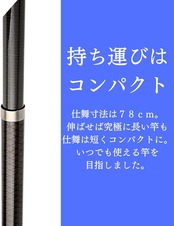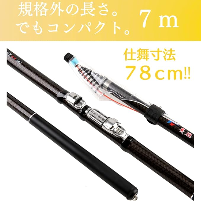 7.2mの超ロング振出ロッド。 とんでもなく長いロッドで取り回しが大変だからこそ、少しでも操作を楽に行えるようカーボン素材でロッドをできるだけ軽量化しているのが特徴です。 これだけの長い振り出し竿で400g以下の商品は他にありません。 竿の硬さは磯竿2号程度。 全長は長いですが仕舞寸法は78センチとコンパクトに収まる優れ物! です。 ※投げる釣りには向いていません(故障の原因になります)