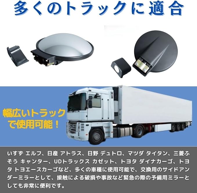 【多くのトラックに適合】いすず エルフ、日産 アトラス、日野 デュトロ、マツダ タイタン、三菱ふそう キャンター、UDトラックス カゼット、トヨタ ダイナカーゴ、トヨタ トヨエースカーゴなど、多くの車種に使用可能で、交換用のアンダーミラーとして、接触による破損や事故など緊急の際の予備用ミラーとしても非常に便利です。