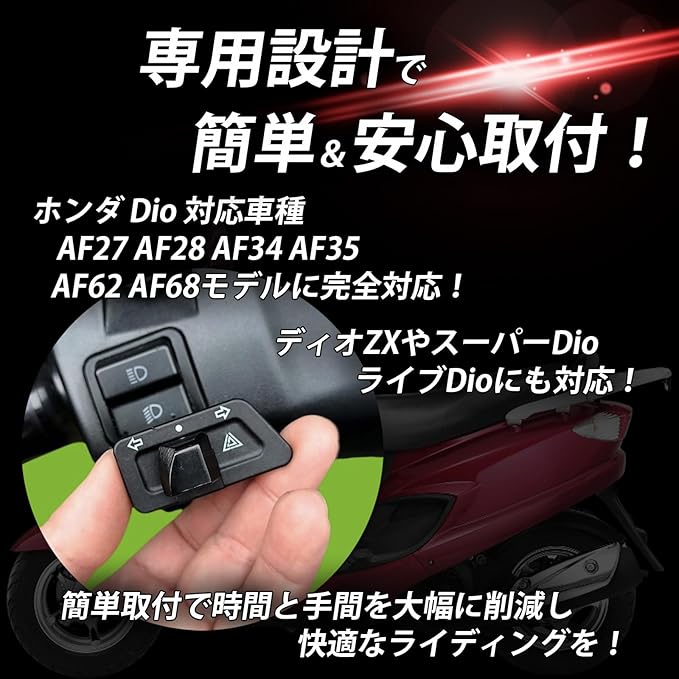 【簡単交換】HTharrosハンドルスイッチは、ホンダ Dio 対応車種 AF27 AF28 AF34 AF35 AF62AF68モデルに完全対応。ディオZXやスーパーDIO、ライブDIOにも対応しています。これにより、幅広いモデルで使用可能で簡単に取り付けられるため、時間と手間を大幅に削減します。これにより、すぐに快適なライディングを再開できます。
